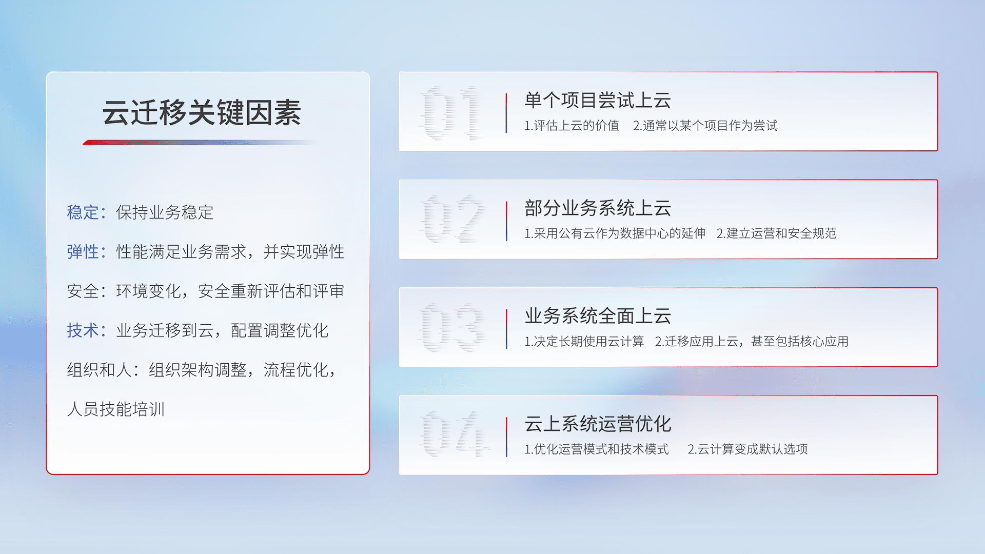 结合实际业务,,从规划设计、、、、云平台选型、、、云原生改造、、、、数据迁移、、集成交付,,迁移全过程为客户识别最佳上云路径,,做好风险识别管理,,,,设计网络架构、、、、身份权限、、安全审计合规、、、、操作审计、、、、日志审计、、、、监控告警策略、、、多站点容灾设计等,,对云上基础设施进行整体规划,,,,提升IT治理水平,,以满足弹性、、高可用、、、、高性能的需求。。。